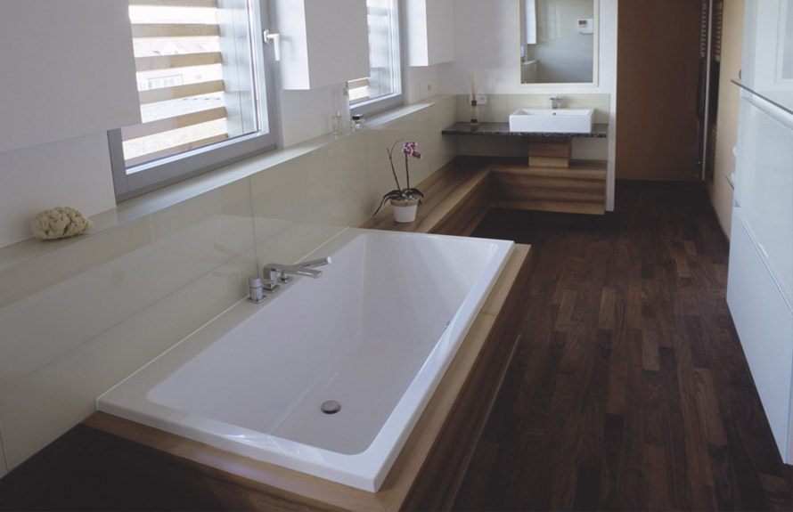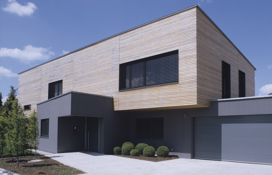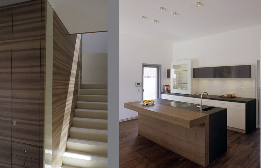 Das OG wurde als formal strenge verbindende Klammer darauf gesetzt. Was von außen Spannung erzeugt, erscheint als Raumfolge im Inneren ruhig, logisch und ganz den Lebensbedürfnissen entsprechend. Zur Verstärkung wurde in Ausbau und Detail auf einfache klare Formensprache geachtet, hochwertige Oberflächen mit natürlichen Materialien. Der Garten teilt sich in den offenen Bereich mit großer Rasenfläche und vor dem Wohnzimmer liegendem Holzdeck, alles umschlossen von einer Hainbuchenhecke. Hinter dem Haus ein, von Betonwänden gefaßter intimerer Raum mit Pool, Pergola und Bambuspflanzung.